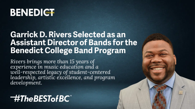 | | Dr. Kimberly Singletary Named New Director of The Benedict College Honors Program | | Dr. Kimberly Singletary describes herself as a “willing worker.” Yet, the new director of the Benedict College Honors Program is a visionary and transformational leader on campus. | | Dr. Brendan L. Johnson has been appointed as the new Director of Bands at Benedict College, where he will lead all ensembles, including the nationally recognized Benedict College Band of Distinction (BCBOD). | | Garrick D. Rivers has been selected as an Assistant Director of Bands, bringing more than 15 years of experience in music education and a well-respected legacy of student-centered leadership, artistic excellence and program development. | | Benedict College proudly announces the appointment of Dr. Melissa Lockard as the new Director of Institutional Planning and Assessment, a pivotal role aimed at driving institutional effectiveness, enhancing student learning outcomes, and fostering a culture of continuous improvement. | | Benedict College recently announced that Dr. Vanessa Harris, Executive Director of the Benedict College B.E.S.T. Lives Center, was nominated to serve as the Post-Secondary Education Representative for the South Carolina Corrections Education Association (SC CEA) for the 2025–26 fiscal year. | | |