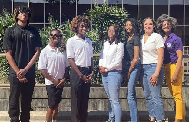 Pictured from left to right: Samuel Washington, Ellenwood, GA, sophomore; Rhonda Hickson, Lake City, SC, senior; Roman Gardner, Atlanta, GA, junior; Gabrielle Bennett, Denmark, SC, senior; Ava Jenkins, Prince George’s County, Maryland, junior; Aliyah Jones, Phoenix, AZ, senior and Keisa Gunby, Ph. D., advisor.