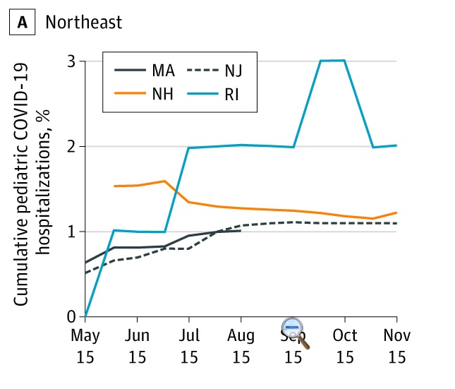 Infection rates in children <18 years of age in Western Mass as reported by Baystate Reference Laboratory has almost doubled in the last month. In early December, infection was 6.22%, but by December 26, it was 9.7% and then by New Year’s, it was 12%. Last week, the infection rate in children in Western Mass was stable at 11%. Hospitalizations are also rising in the country, reflecting the higher infection rates. Just published in JAMA, there were 5364 pediatric COVID-19 hospitalizations in 22 states between May and November, with large variations across states. The figure shows the percent of pediatric patients hospitalized with COVID19 in 4 New England states since the pandemic began. In MA, data was collected to mid-August and the percent of hospitalized patients who are <19 years old increased to about 1%. We saw a small uptick in COVID19 patients admitted to our children’s hospital in mid-December, but a fairly stable admission rate since Christmas. Overall, 2.2% of hospitalized patients at Baystate have been children <22 years. Also very reassuring is a publication this month in Pediatrics that indicates transmission of the virus causing COVID19 is low in schools. Researchers from Duke University and the University of North Carolina at Chapel Hill found just 32 cases of in-school transmission among nearly 100,000 students and staff over a nine-week period. As more data is published indicating it is safe to return to school and as more teachers are able to be vaccinated, it is imperative for our children’s education and development that they return to in-person school. Baystate Children’s Hospital faculty are in strong agreement with the AAP that children should return to school ASAP.