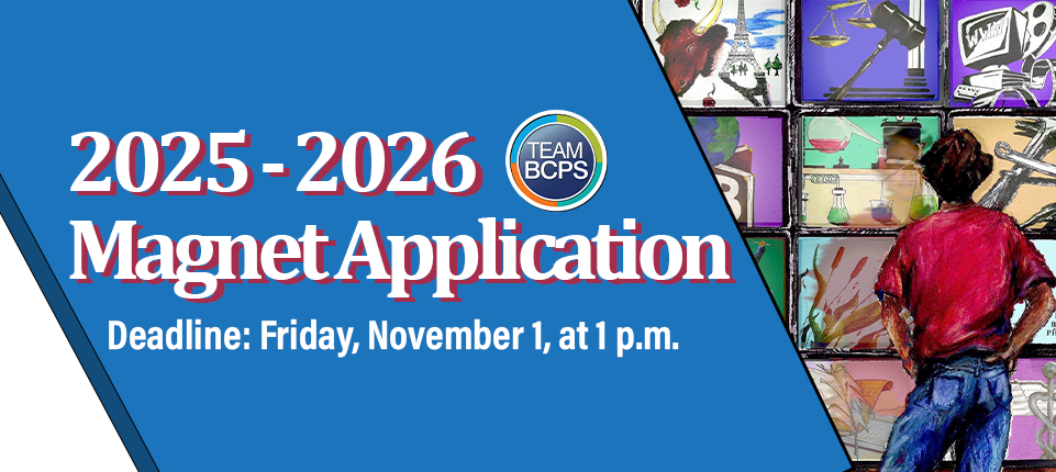 The deadline for the BCPS magnet application is rapidly approaching! Parents interested in having their child participate in a magnet program next school year must submit an online application by 1 p.m. on Friday, November 1. Principals are asked to ensure their students and families are aware of this deadline.