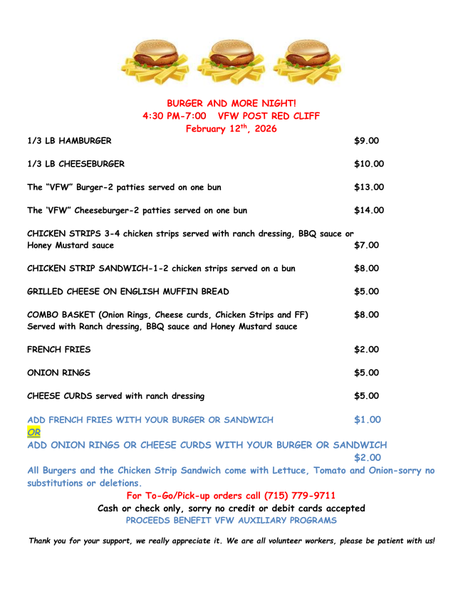 Please join us at the VFW this month. Our Burger night is on Thursday February 12 from 4:30-7:00 p.m. Cash or check only for payment-sorry no credit or debit cards. To go orders or eat in!