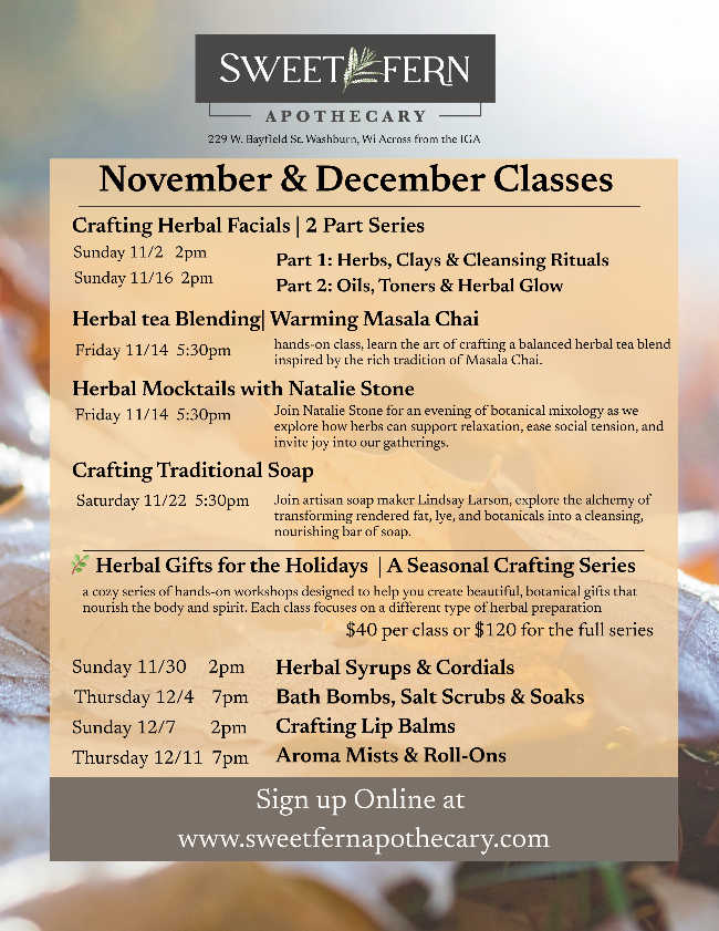 | | November & December Classes at Sweet Fern Apothecary | | |