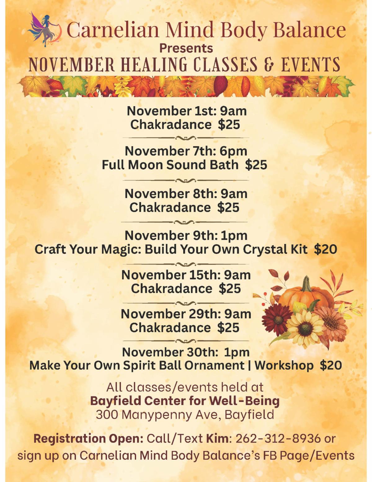 Our November classes and events are designed to help you align your energy, restore inner peace, and connect with your highest self. Whether you're new to energy healing or deepening your practice, this is your time to shine. Registration is now open! Reserve your space and begin your healing journey — contact Kim at 262-312-8936 to sign up.