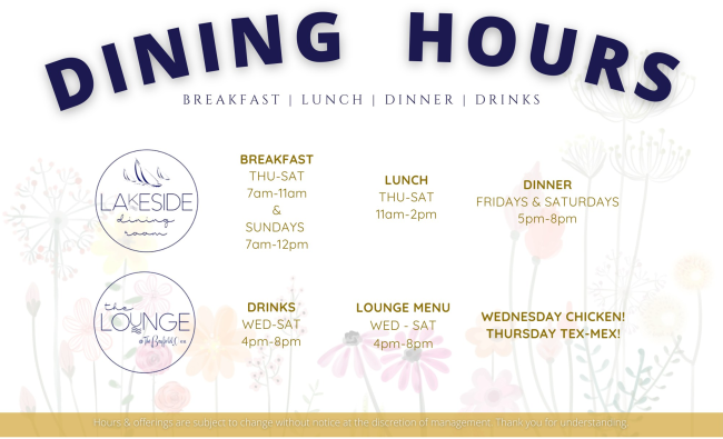 Breakfast: Thursday - Saturday 7:00 - 11:00 a.m., Sunday 7:00 a.m. - Noon