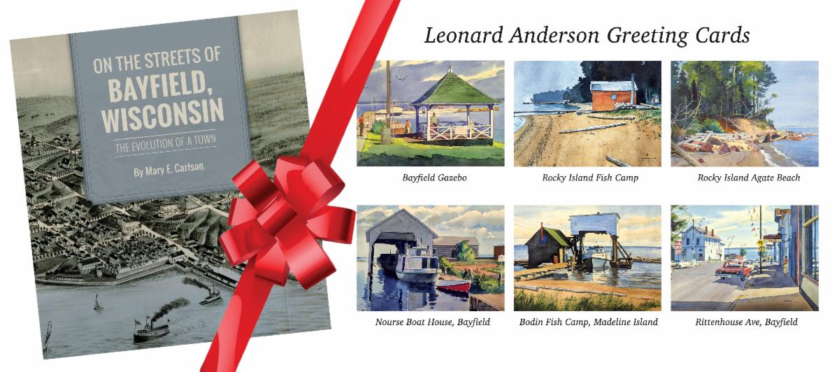Mary Carlson's 'On the Streets of Bayfield, Wisconsin' ($25) brings to life the people, landmarks, and historical moments that have shaped Bayfield's character. Or 6-packs of Leonard Anderson Watercolor Collection Cards depicting Bayfield in the 60s, for any event ($20).