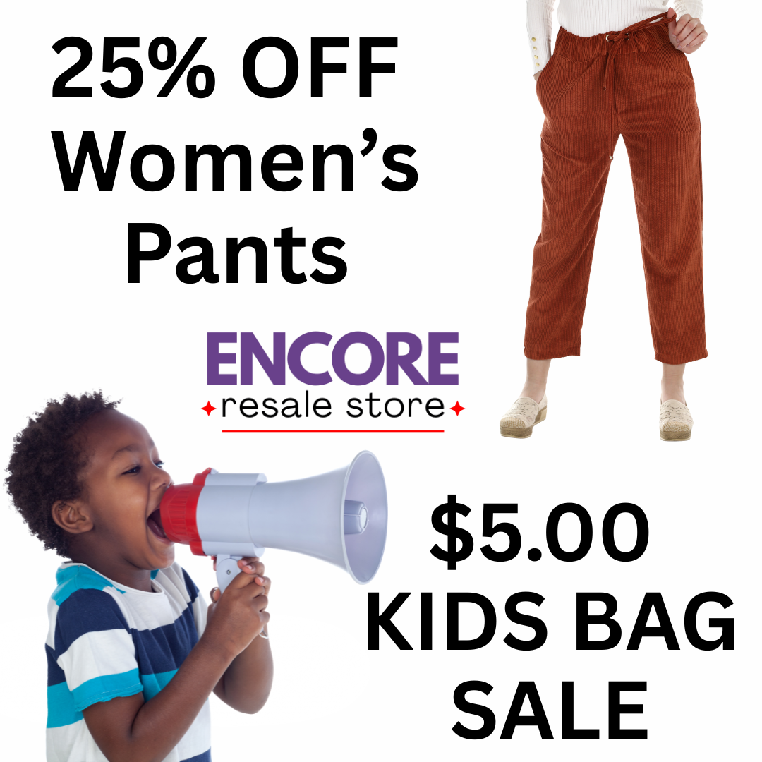 $5 Kids Bag Sale - covers toys, books, & clothing. 25% off all Women’s Pants.