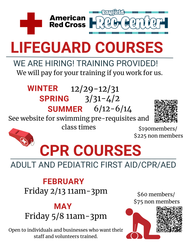 Lifeguard course offered over winter break for teens looking for a good year-round job. CPR classes are open to everyone who wants to learn life-saving skills - especially good for businesses with staff who serve the public.