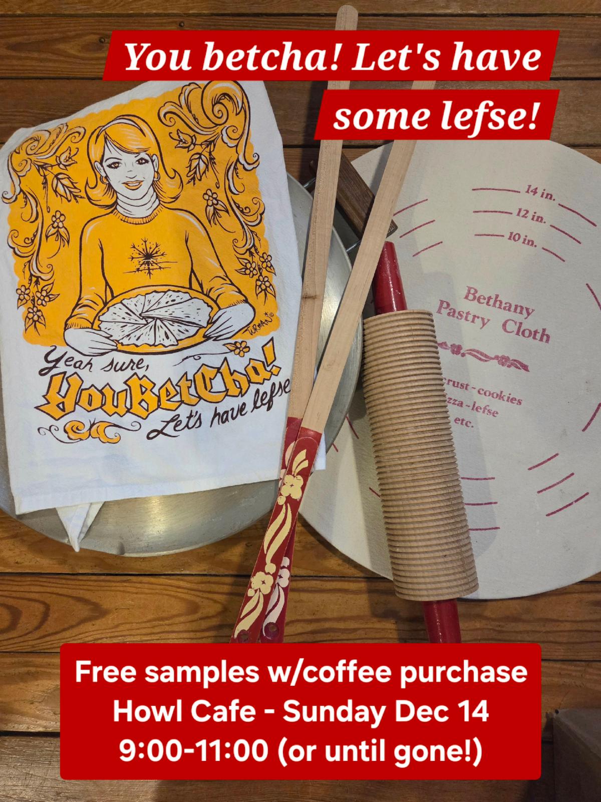 Lefse Master Mary will be making lefse in the cafe on Sunday, December 14, 9:00 - 11:00 a.m. Stop in for a free fresh sample with your coffee purchase!