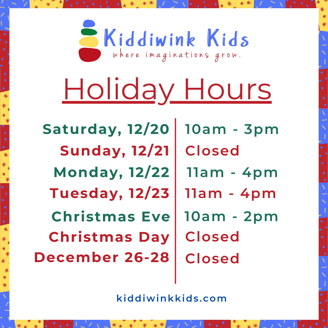 We’re soaking up all the holiday magic here at Kiddiwink Kids! We have expanded our hours to help you find the perfect gift for the big or little kid in your life! Whether you’re popping in for stocking stuffers, sensory kits, creative play gifts, or just a little sparkle of fun, we’re here and excited to help you find the perfect items to make the season bright. Thank you for shopping local, supporting small businesses, and spreading joy in our community!