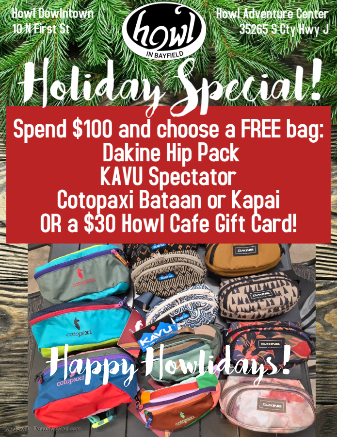 Howliday Special - Spend $100 and choose a FREE bag from Dakine (Hip Pack), KAVU (Spectator), or Cotopaxi (Bataan or Kapai) OR get a $30 Gift Card for Howl Cafe! Perfect for gifting!