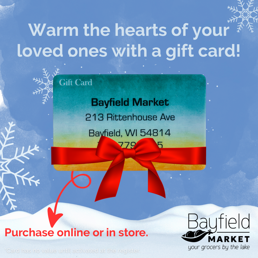 If you have a loved one living in or traveling to the Bayfield area, please consider what a wonderful gift a Bayfield Market gift card would be for them this holiday season (or for any celebration in the upcoming year). Easily purchase online, and we’ll mail it to their home.