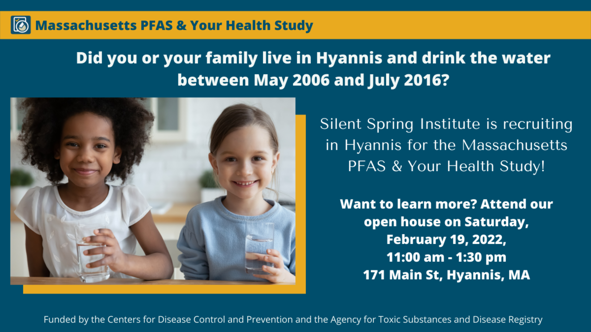Silent Spring Institute invites current and former residents in Hyannis to an Open House on Saturday February 19th from 11:00 am to 1:30 pm to learn about the Massachusetts PFAS and Your Health Study—one of seven projects funded by the Centers for Disease Control and Prevention (CDC) and the Agency for Toxic Substances and Disease Registry (ATSDR) to investigate the human health effects of PFAS contaminants in drinking water.