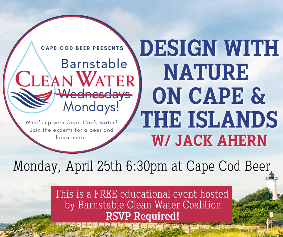 Join us Monday, April 25th at 6:30pm for a timely springtime presentation on how to preserve the beauty of Cape Cod and the Islands with ecologically-based landscaping with Jack Ahern, Landscape Architect, UMass Amherst Professor Emeritus and BCWC Board Member. The talk is a preview of his newly published book "Designing with Nature on Cape Cod and the Islands" which will be available at the event.
