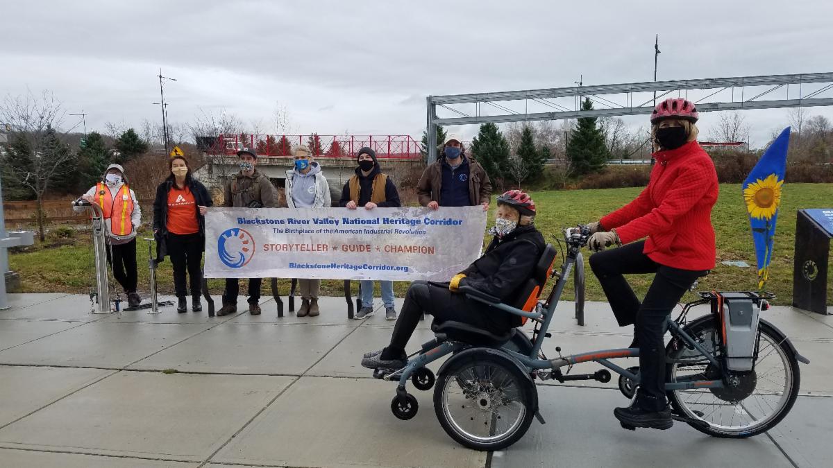 In its quest to continue providing adaptive recreation programs in the Blackstone River Valley, the Blackstone River Valley National Heritage Corridor (BRVNHC) has acquired a state-of-the-art, electric-assist wheelchair bicycle. A grant received from the Network of the National Library of Medicine, New England Region (NNLM,) provided the funds to purchase a Van Raam OPair bicycle from Bike-On of Warwick, RI. BRVNHC is partnering with All Out Adventures of Northampton, MA, who will be caretakers of the bike, to offer adaptive cycling to people with mobility impairments and their caregivers in the Blackstone River Valley.