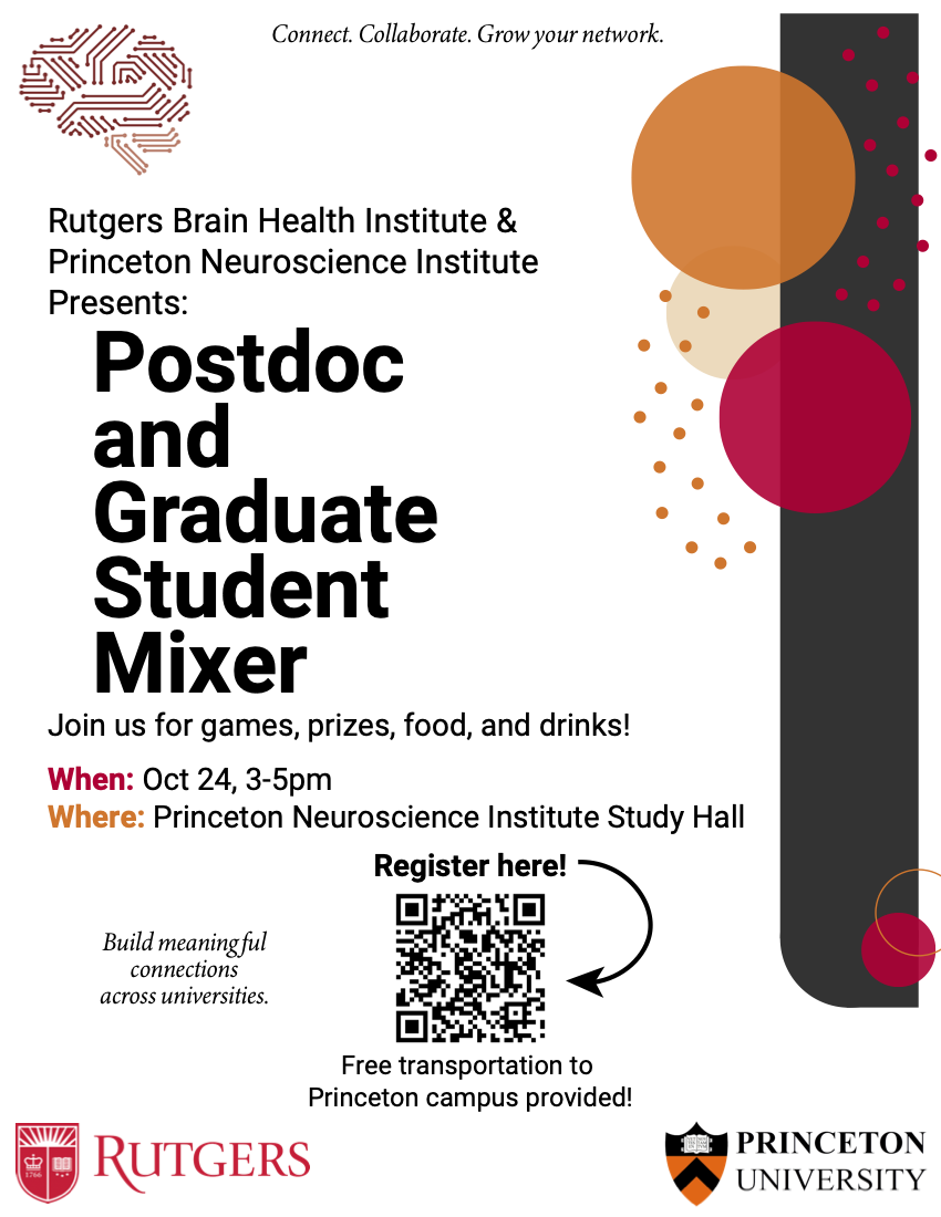 Join us for the first Princeton Neuroscience Institute × Rutgers Brain Health Institute Social Science Mixer. Our goal is simple: to build meaningful connections across universities. Come enjoy an afternoon of games, prizes, food, and drinks!! Maybe you'll even meet your next collaborator (or friend!) over a round of trivia. Free transportation from Rutgers to Princeton will be provided.