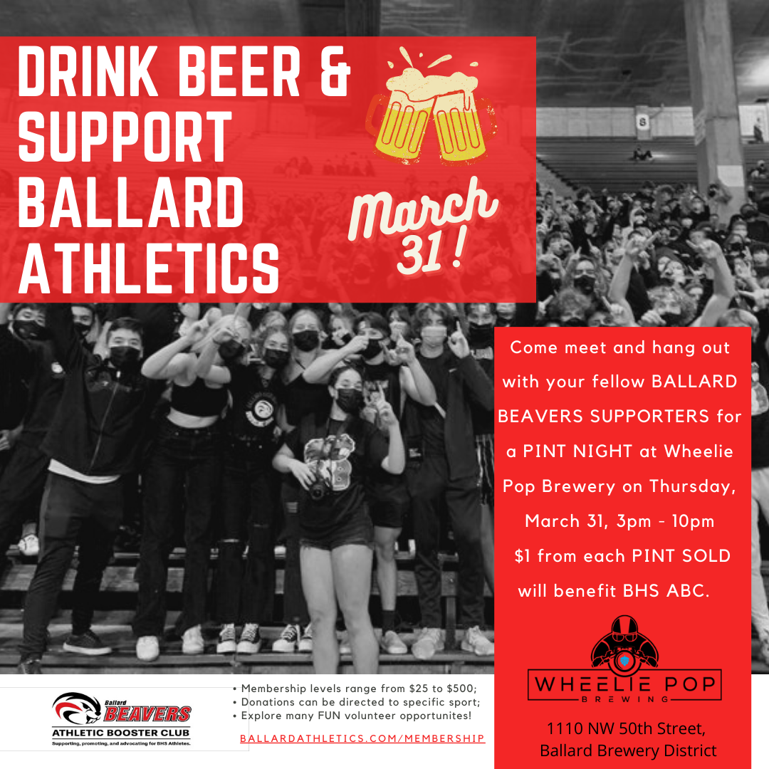 Ballard Athletics parents, coaches, and fans of all ages: please join the BHS Athletic Booster Club for Pint Night on Thursday, March 31 from 3-10 pm at Wheelie Pop Brewery, 1110 NW 50th St. (www.wheeliepopbrewing.com) Kid and Dog-Friendly too!