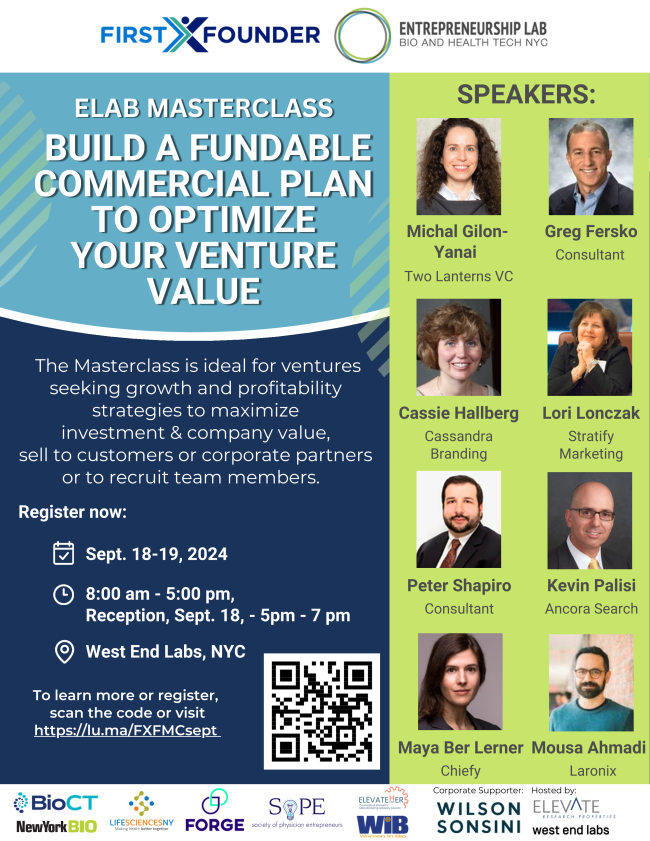 Join ELab NYCMasterclass: Build a Fundable Commercial Plan to Optimize your Venture Value September 18-19, 2024, at West End Labs, NYC (or virtually). Gain invaluable insights and strategies for success.