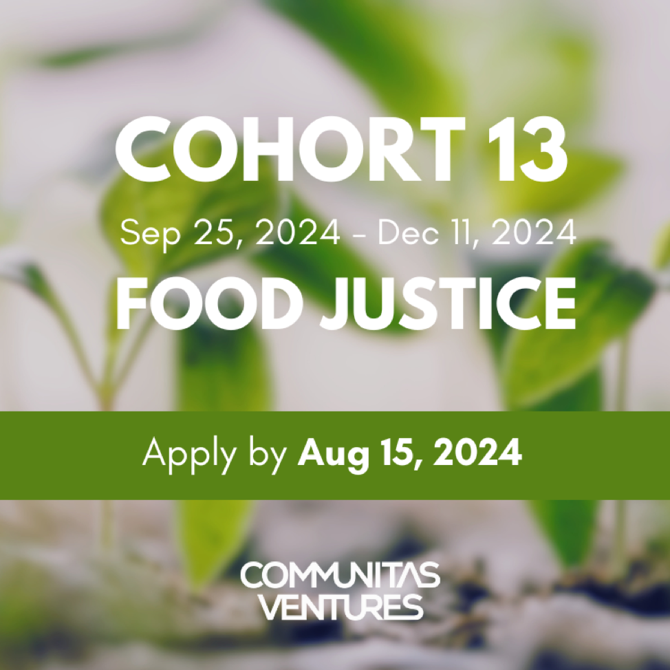 Communitas America is now accepting applications for Cohort 13 of the Communitas Ventures accelerator, running from September 25, 2024 to December 11, 2024. For Cohort 13, they invite applicants with ventures focused on food justice. Apply by August 15, 2024.