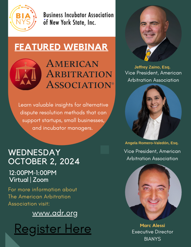 Unlock the power of alternative dispute resolution for your startup by joining the Business Incubator Association of New York State (BIANYS) for an exclusive webinar featuring expert speakers from the American Arbitration Association (AAA).