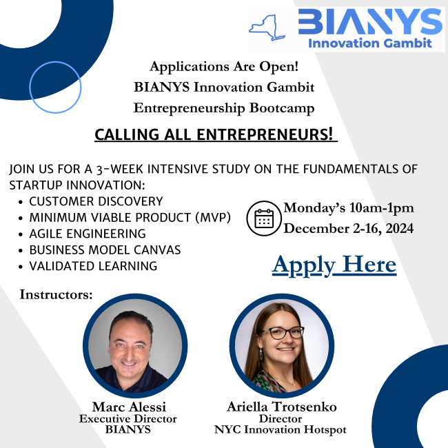 The Business Incubator Association of New York State's Entrepreneurship Bootcamp is now open for applications! This comprehensive training provides aspiring entrepreneurs with a robust framework for building their companies, drawing on the principles of the Lean Startup Method. Key features of the program include: