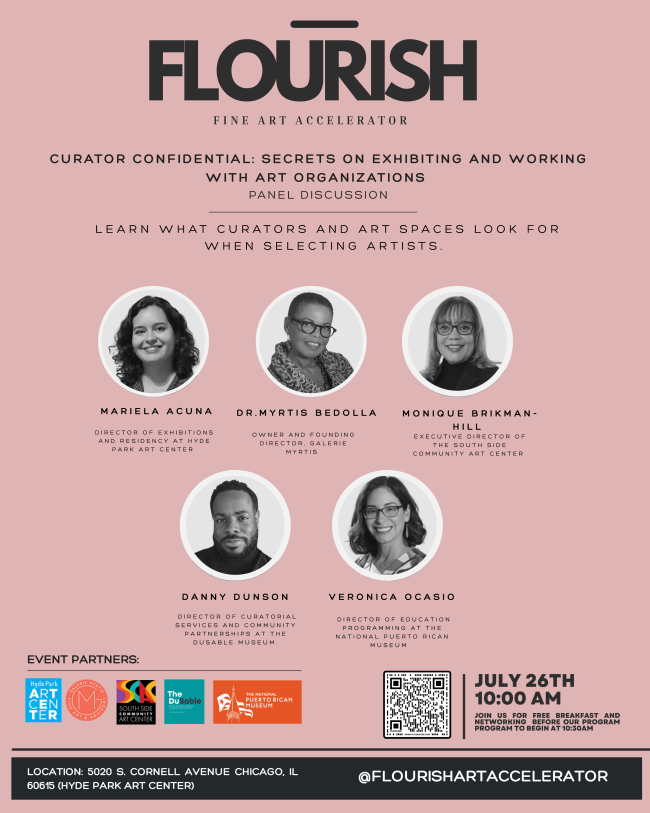 Flourish Fine Art Accelerator presents Curator Confidential: Secrets on Exhibiting and Working with Art Organizations, an in-person panel discussion designed to provide emerging artists, curators, and collectors with rare, behind-the-scenes insight into how art institutions select artists and curate exhibitions.