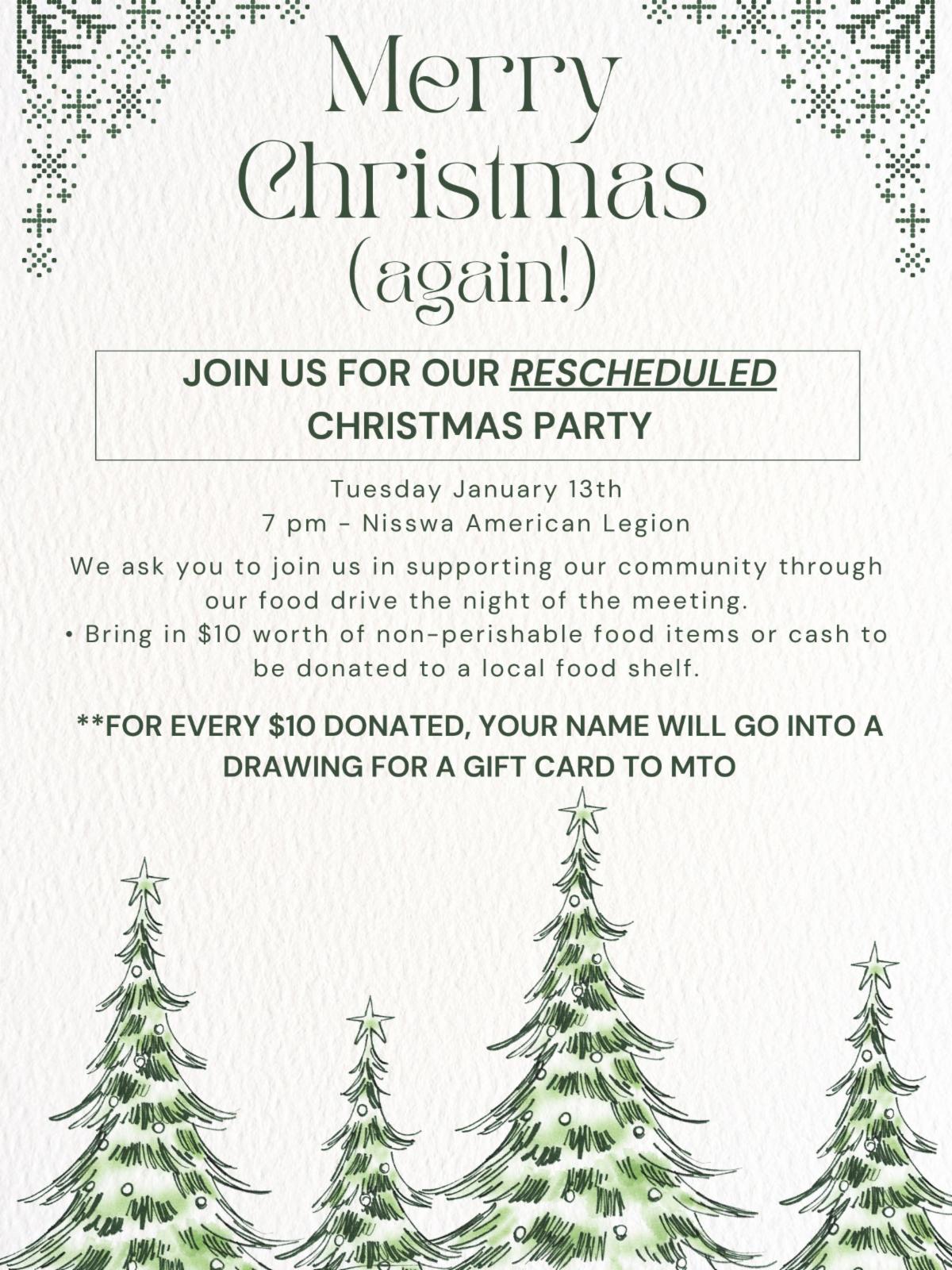 With the cancellation of last month's meeting, where we usually do a food/toy drive for Christmas we will only be doing a food drive this month, to help local food shelves. We will be having our yearly Christmas party (rumor has it there are a few meat packages from a local meat market to win). Chapter elections will also be held at this month's meeting. The meeting is next Tuesday in case anyone needs a reminder.