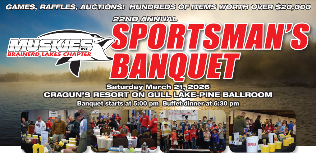 The Sportsman's banquet tickets are now available. It's the 22nd annual, and we are holding the event at Cragun's Pine Ballroom again this year. We limit the ticket sale to 160 with only 25 youth tickets. The youth tickets go fast so if you are interested in bringing some kids along make sure you purchase soon. Each kid with a ticket has a chance at winning a lifetime fishing lic. This is our chapter's main resource for funding. It helps with everything from supporting area youth fishing teams, helping with Leech Lake Telemetry Study, and it also helps purchase pit tagging equipment for area DNR offices. All things that make muskie fishing better in Minnesota.