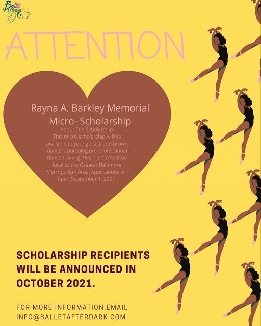 In honor of the positive, lasting impact Rayna A. Barkley had on the lives of Baltimore City youth, Ballet After Dark joyfully announces that applications are now open for the Rayna A. Barkley Memorial Micro-Scholarship. This scholarship is offered to young Black and Brown dancers in the greater Baltimore metro area who are pursuing pre-professional dance training. Two young dancers will be awarded one $250 award and one $500 award. Runners up will win a dance photo shoot with @candicemichelleportraits. Grant recipients will be awarded October 4, 2021. For more information, please email info@balletafterdark.com.