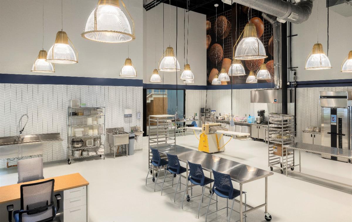 The office space was programmed to feature a synergetic research and development baking-specific kitchen/lab, a newly added 2nd floor business office center with applicable support spaces, a product manufacturing facility, and a factory-employee welfare suite featuring new locker rooms, factory-focused private offices, a wellness room, and employee kitchen/café doubling as a multi-purpose space.
