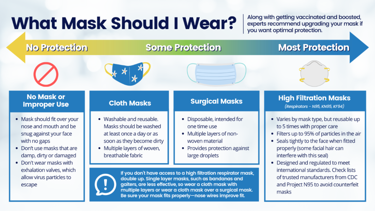 As we are experiencing another surge in COVID-19 cases, it’s more important than ever to continue wearing tight-fitting masks in public settings. We know that appropriate masking significantly reduces transmission of the virus, and that the type of mask you wear and how you wear it is critical in keeping yourself and others safe.