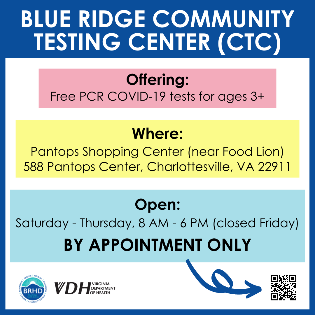 There is a new free COVID-19 testing resource in the Blue Ridge Health District! The Blue Ridge Community Testing Center (BR CTC) will open on Saturday, January 15, 2022. It is located at 588 Pantops Center, Charlottesville, VA 22911 (an indoor site near Food Lion) and will provide free PCR tests for anyone ages 3+ by appointment only. The BR CTC will be open Saturdays through Thursdays from 8:00 AM to 6:00 PM (last appointment at 5:30 PM). The CTC is closed Fridays.