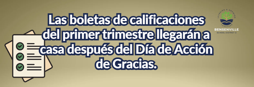 Al finalizar el primer trimestre, las familias pueden esperar que las boletas de calificaciones se envíen a casa después de las vacaciones de Acción de Gracias (se enviarán por correo antes del 2 de diciembre). Estas boletas de calificaciones brindan una oportunidad importante para revisar el progreso de su hijo y celebrar su crecimiento en lo que va del año escolar.