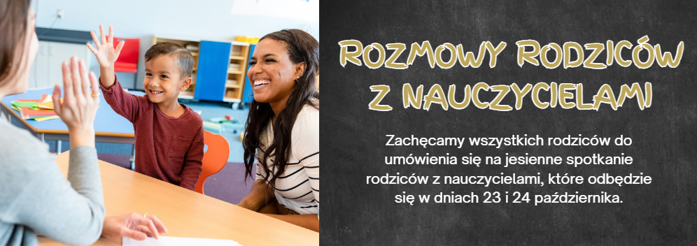 Zapraszamy wszystkich rodziców i opiekunów do udziału w jesiennych spotkaniach rodziców z nauczycielami, które odbędą się w czwartek 23 października lub piątek 24 października. Jest to cenna okazja do spotkania się z nauczycielem Państwa dziecka, omówienia jego postępów i zaplanowania pozostałej części roku szkolnego. Prosimy o jak najszybsze ustalenie terminu spotkania.
