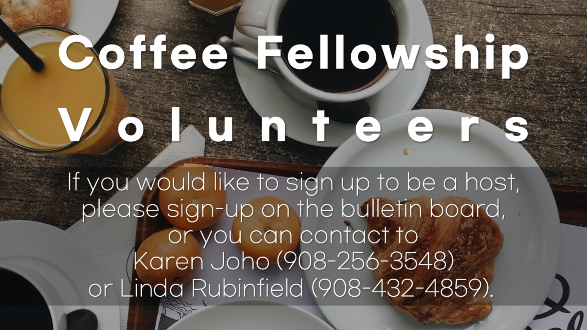Coffee Fellowship is resuming in Fellowship Hall. We are looking for volunteers to provide snacks for our coffee fellowship following the Sunday worship service. A new sign-up sheet will be on the bulletin board tomorrow.