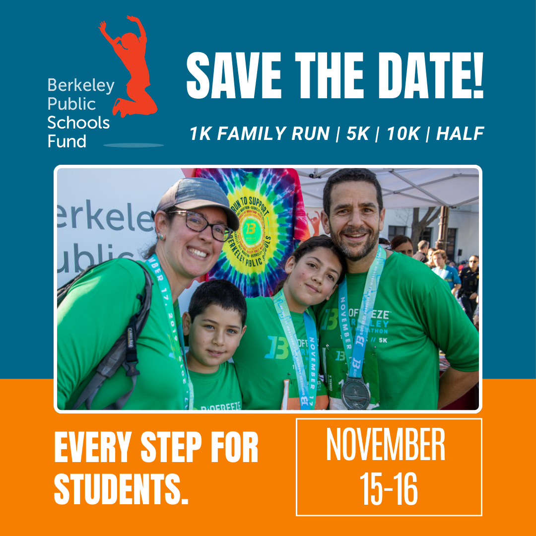 | | Run for Berkeley Students | | This year, the Berkeley Public Schools Fund is once again partnering with the Berkeley Half Marathon on Nov.15-16 in support of Berkeley public schools. | | |