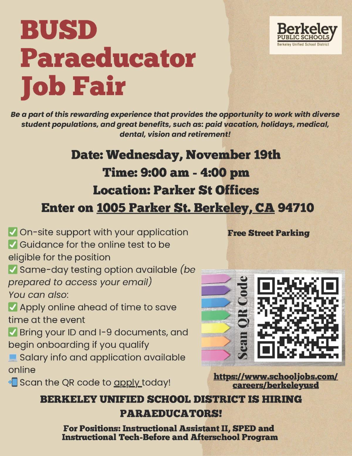 BUSD is holding a Paraeducator Job Fair on Wednesday, November 19th from 9:00 am - 4:00 pm at the Parker St Offices (1005 Parker St, Berkeley, CA 94710).