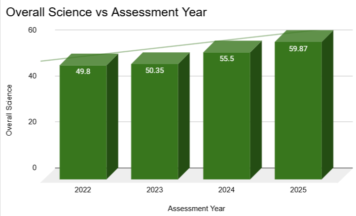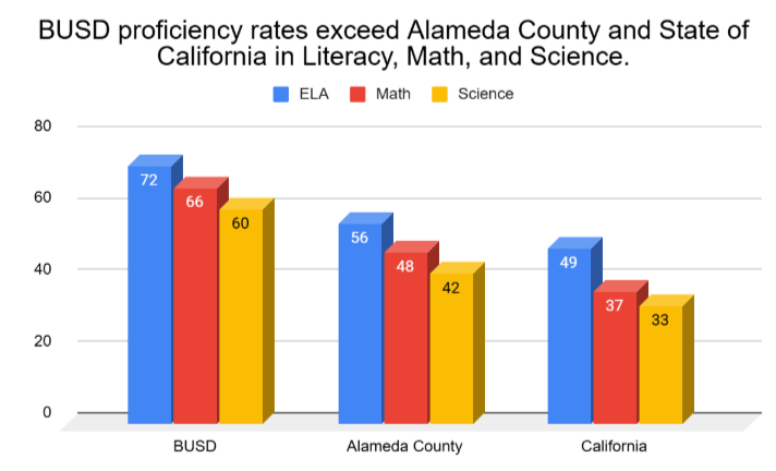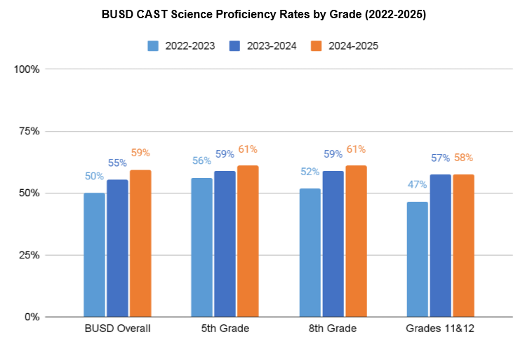 In 2024–25, 59% of BUSD students met or exceeded the state science standards, a four percent increase from the previous year.