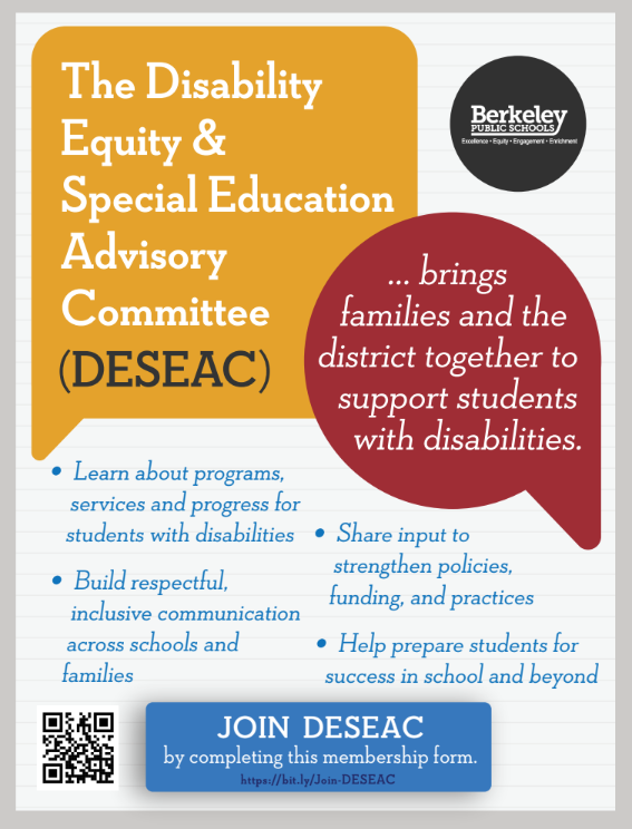 Are you interested in supporting students with disabilities in Berkeley Public Schools? Consider joining the Disability Equity & Special Education Advisory Committee (DESEAC).