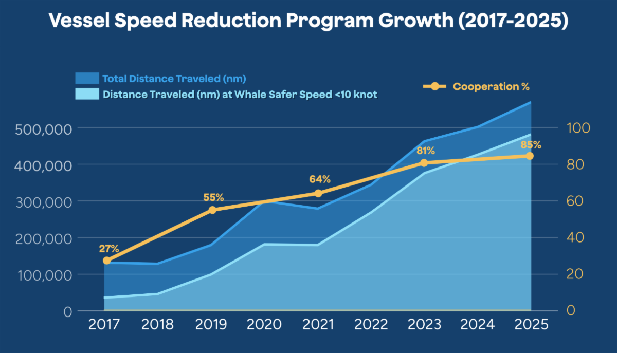 | 2025 Season Cooperation Results Released | We are proud to announce the 2025 VSR Season results from the efforts of participating shipping lines. Over the season, 787 participating vessels traveled over 481,000 nautical miles at whale-safer speeds of 10 knots or less. This is up from ~425,900 nautical miles and 743 participating vessels in the prior 2024 VSR Season. | |