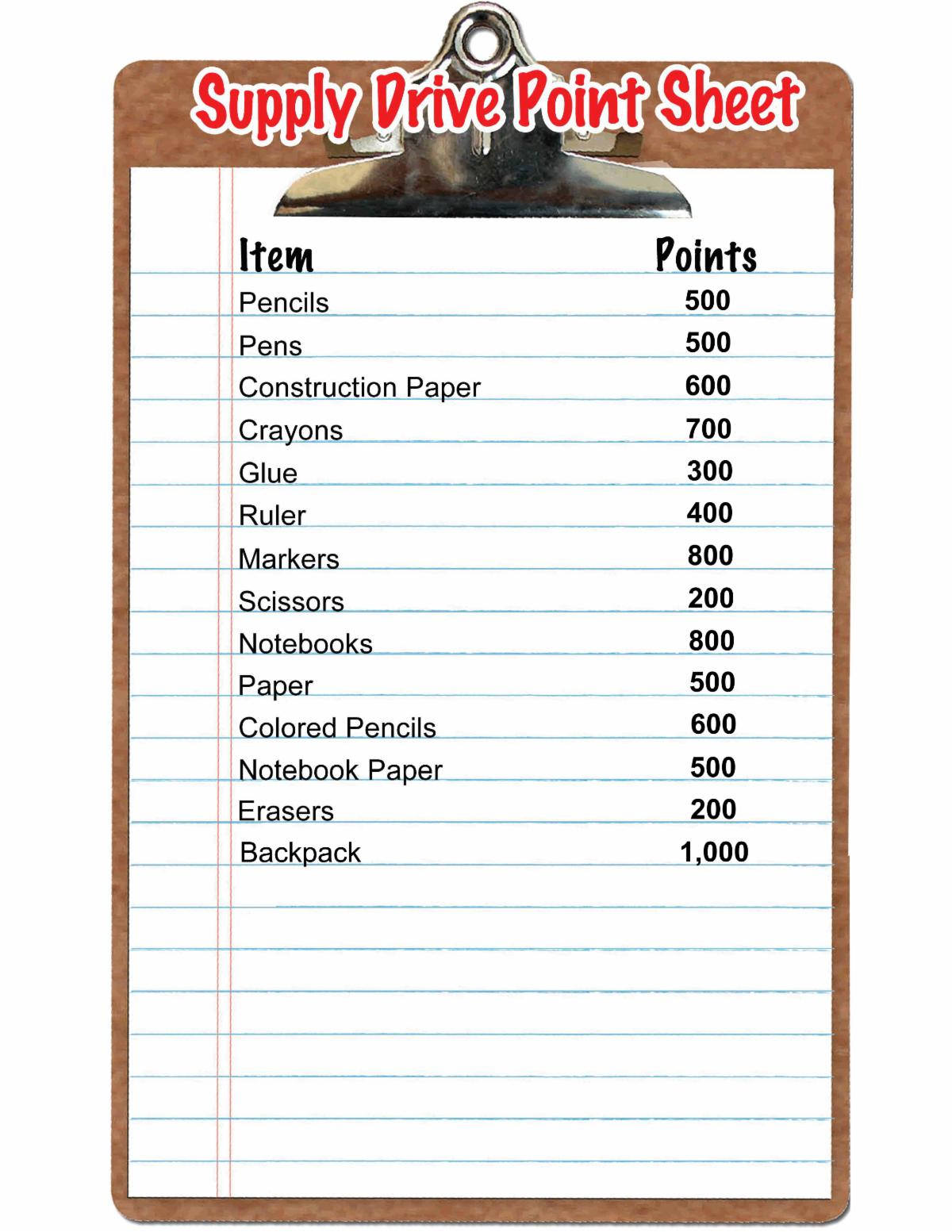 There will be different points assigned to each school supply item. So there will be "This" many points for a pack of pencils. And "This" many points for a pack of erasers, and so on. So check out the scoring sheet below to see how much each item is worth.