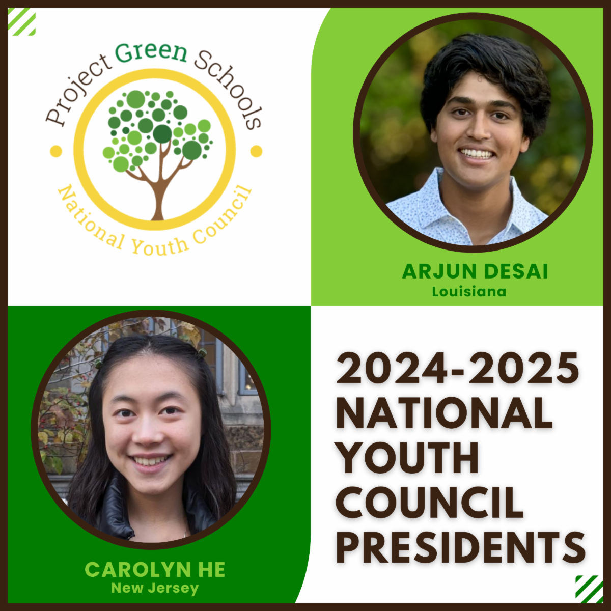 Arjun and Carolyn are outstanding young environmental leaders who have made a tangible impact on their peers, schools, and communities. We are confident that the National Youth Council will flourish under their leadership and eagerly anticipate their inspiring contributions!