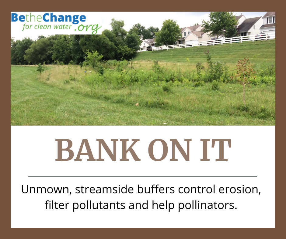 We <3 Buffers. If your property has a body of water or is located near one, maintain a vegetative buffer of at least a few feet around the waterway or on your property. The more buffer, the better. Buffers are excellent at capturing and reducing pollution and contaminants that would otherwise enter the body of water. Plants are natural filters.