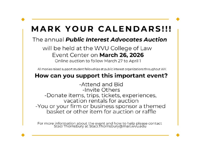 The West Virginia Bar Foundation is in need of a new Executive Director. Founded in 1988, the Foundation is a 501(c)(3) non-profit organization that offers grants for the better administration of justice in the state, funds various projects (including educational projects) and promotes the rule of law. The Executive Director fulfills the Foundation’s management duties and assists the Foundation’s Board of Directors in carrying out its policies and procedures. The Executive Director, who is an independent contractor, would be expected to work, on average, about forty (40) hours per month. If interested, please send your resume to P. O. Box 11010, Charleston, WV 25339. Compensation will be set based upon qualifications. Application deadline is March 15, 2026.