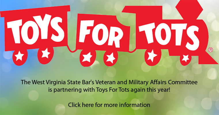 The West Virginia State Bar's Veteran and Military Affairs Committee has adopted Toys for Tots as its 2025 Service Project. If you want to make a child's Christmas happier, please consider participating in the Service Project. Collection boxes will be dropped off in the Charleston area before October 15, 2025. The boxes will be picked up on December 1 and December 2. If you are interested in participating in the service project by hosting a box, please contact Mary Jane Pickens at pickensmj@wvbar.org or Kenadee Murphy at murphyk@wvbar.org before October 6, 2025. If you wish to make a monetary contribution, make your check payable to Toys for Tots and mail to or drop off at the State Bar. Monetary contributions must be received by December 2.