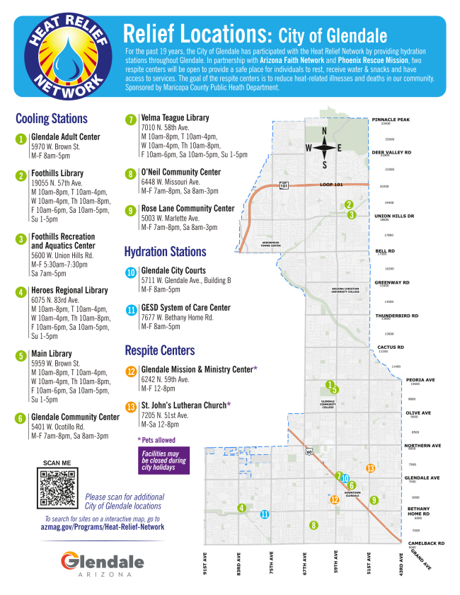 With several more months of dangerously hot temps, there are times when temperatures become life-threatening for many residents. The City of Glendale in partnership with Phoenix Rescue Mission and Arizona Faith Network provide heat relief for anybody who is in need of water or a cool place to hang out during the hottest parts of the day. Glendale has 2 respite centers, 2 hydration stations and 9 cooling centers. Locations and hours can be found on the map below.