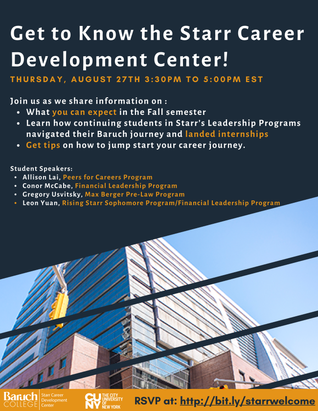 Welcome to Baruch College! We are writing to provide you with information regarding our programs and services at the Starr Career Development Center.