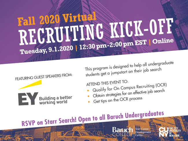 Hear from EY on how to jump start your job search and gain insight on Baruch's On Campus Recruiting Program!