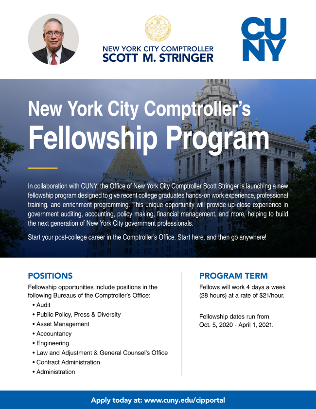 The NYC Comptroller's Fellowship is a newly launched opportunity for recent college graduates to gain professional experience at one of City government's premier financial agencies. Open only to CUNY graduates, the Fellowship is a six-month program in which you will work 28 hours a week in the Comptroller's Office, receive training, and participate in enrichment activities. Fellows will work in bureaus throughout the Comptroller's Office including: Accountancy, Audit, Engineering, Public Affairs & Policy, Contract Administration, Asset Management, and more.