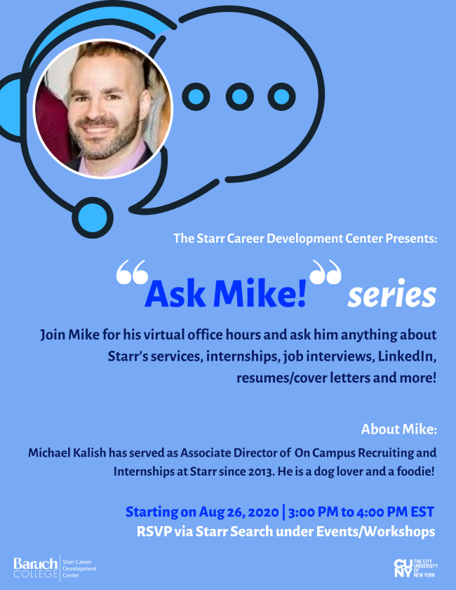Join Mike for his virtual office hours and ask him anything about Starr's services, internships, job interviews, LinkedIn, resumes/cover letters and more!