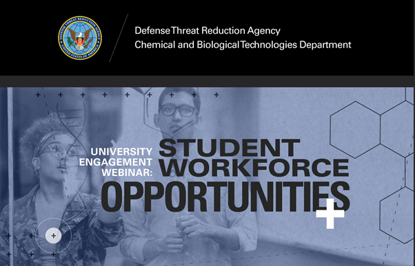 The Defense Threat Reduction Agency's Chemical and Biological Technologies Department (DTRA CB) is hosting a university engagement webinar on “Student Workforce Opportunities” on Wednesday, September 30, 2020 from 1:00 p.m. to 2:30 p.m. (EDT).